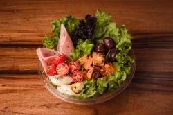 Mix de verdes, pollo teriyaki, aceitunas negras, cherry, palta, jamón, huevo y mix de semillas.