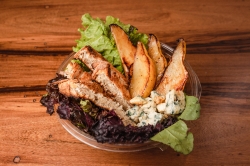 Mix de verdes, queso azul, crutones, peras o manzanas quemadas, albahaca fresca y cherry.