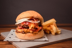 Doble medallón de 150 gr, cheddar, panceta y cebolla morada (Pan a elección: Clásico, remolacha o carbón)